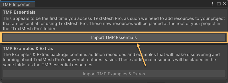 もしTMP Importerのダイアログが表示された場合は、Import TMP Essentials を選択します。Import TMP Essentialsを選択したら、TMP Importerを閉じます。