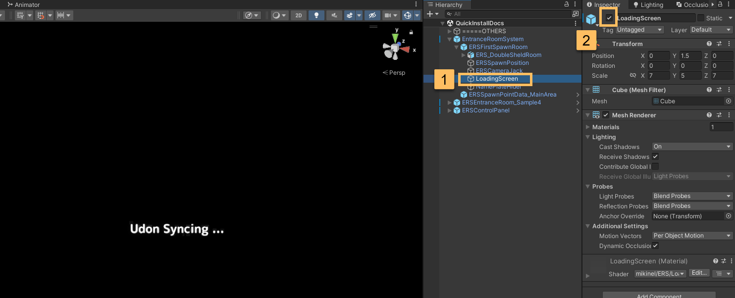 🟠 応用項目"Udon Syncing..."の非表示化"Udon Syncing..."の非表示化 EntranceRoomSystemオブジェクトの子階層に含まれる LoadingScreen オブジェクトを無効化することで、ジョイン時に表示される "Udon Syncing..." という表示を消すことができます。